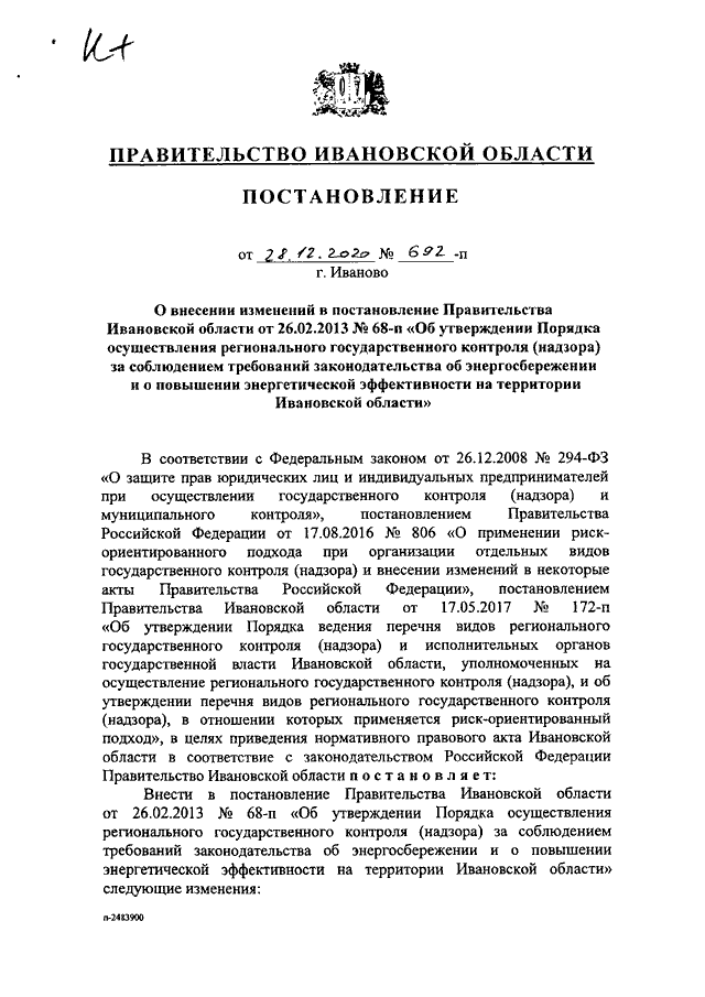 Постановление Правительства Ивановской области от 28.12.2020 N 692-п "О внесении изменений в постановление Правительства Ивановской области от 26.02.2013 N 68-п "Об утверждении Порядка осуществления регионального государственного контроля (надзора) за соблюдением требований законодательства об энергосбережении и о повышении энергетической эффективности на территории Ивановской области"