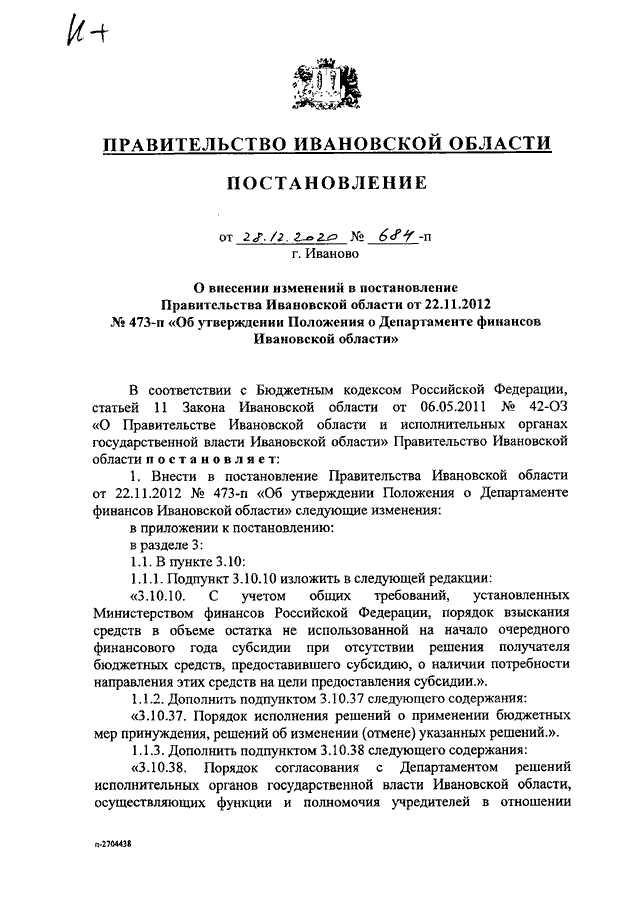 Постановление Правительства Ивановской области от 28.12.2020 N 684-п "О внесении изменений в постановление Правительства Ивановской области от 22.11.2012 N 473-п "Об утверждении Положения о Департаменте финансов Ивановской области"