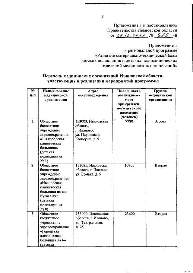 Постановление Правительства Ивановской области от 28.12.2020 N 683-п "О внесении изменений в постановление Правительства Ивановской области от 13.07.2018 N 200-п "Об утверждении региональной программы "Развитие материально-технической базы детских поликлиник и детских поликлинических отделений медицинских организаций" (вместе с "Перечнем медицинских организаций Ивановской области, участвующих в реализации мероприятий программы", "Перечнем медицинских изделий, планируемых к приобретению в рамках реализации программы")