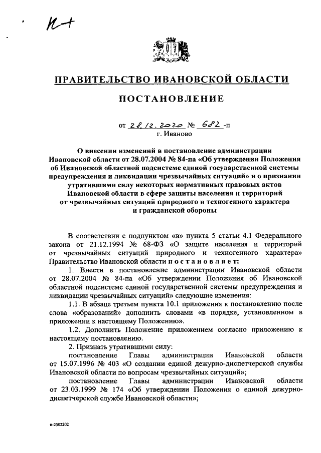 Постановление Правительства Ивановской области от 28.12.2020 N 682-п "О внесении изменений в постановление администрации Ивановской области от 28.07.2004 N 84-па "Об утверждении Положения об Ивановской областной подсистеме единой государственной системы предупреждения и ликвидации чрезвычайных ситуаций" и о признании утратившими силу некоторых нормативных правовых актов Ивановской области в сфере защиты населения и территорий от чрезвычайных ситуаций природного и техногенного характера и гражданской обороны" (вместе с "Порядком обеспечения на муниципальном уровне едиными дежурно-диспетчерскими службами муниципальных образований Ивановской области координации деятельности органов повседневного управления Ивановской областной подсистемы единой государственной системы предупреждения и ликвидации чрезвычайных ситуаций и гражданской обороны, организации информационного взаимодействия территориальных органов федеральных органов исполнительной власти, исполнительных органов государственной власти, органов местного самоуправления муниципальных образований Ивановской области и организаций при решении задач в области защиты населения и территорий от чрезвычайных ситуаций и гражданской обороны")