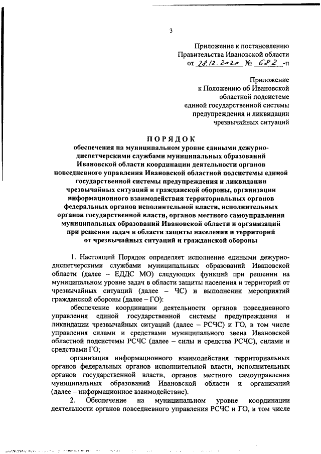 Постановление Правительства Ивановской области от 28.12.2020 N 682-п "О внесении изменений в постановление администрации Ивановской области от 28.07.2004 N 84-па "Об утверждении Положения об Ивановской областной подсистеме единой государственной системы предупреждения и ликвидации чрезвычайных ситуаций" и о признании утратившими силу некоторых нормативных правовых актов Ивановской области в сфере защиты населения и территорий от чрезвычайных ситуаций природного и техногенного характера и гражданской обороны" (вместе с "Порядком обеспечения на муниципальном уровне едиными дежурно-диспетчерскими службами муниципальных образований Ивановской области координации деятельности органов повседневного управления Ивановской областной подсистемы единой государственной системы предупреждения и ликвидации чрезвычайных ситуаций и гражданской обороны, организации информационного взаимодействия территориальных органов федеральных органов исполнительной власти, исполнительных органов государственной власти, органов местного самоуправления муниципальных образований Ивановской области и организаций при решении задач в области защиты населения и территорий от чрезвычайных ситуаций и гражданской обороны")
