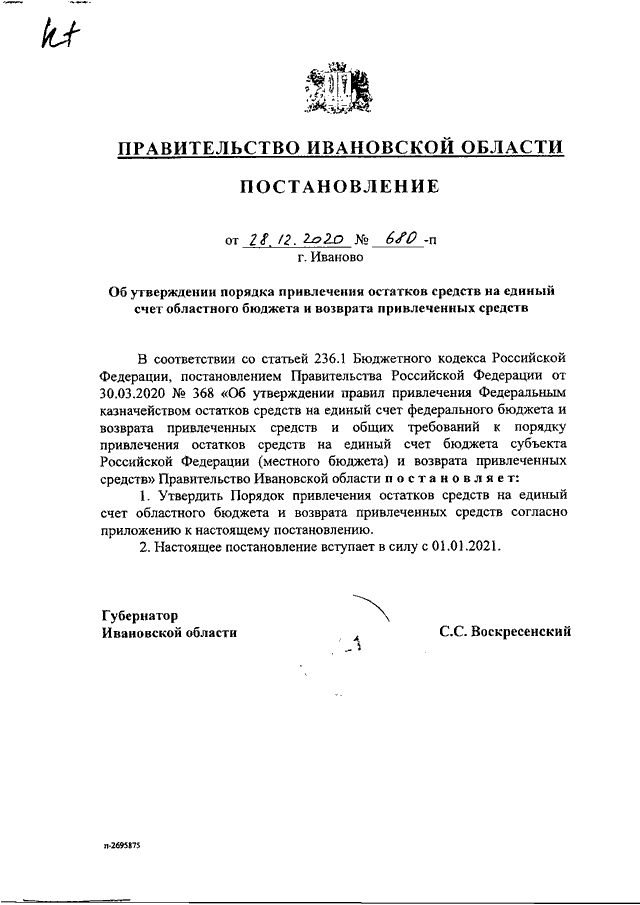 Постановление Правительства Ивановской области от 28.12.2020 N 680-п "Об утверждении порядка привлечения остатков средств на единый счет областного бюджета и возврата привлеченных средств"