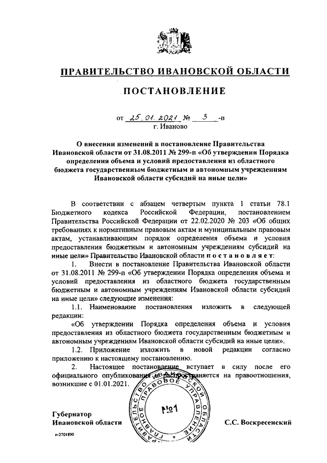 Постановление Правительства Ивановской области от 25.01.2021 N 3-п "О внесении изменений в постановление Правительства Ивановской области от 31.08.2011 N 299-п "Об утверждении Порядка определения объема и условий предоставления из областного бюджета государственным бюджетным и автономным учреждениям Ивановской области субсидий на иные цели"