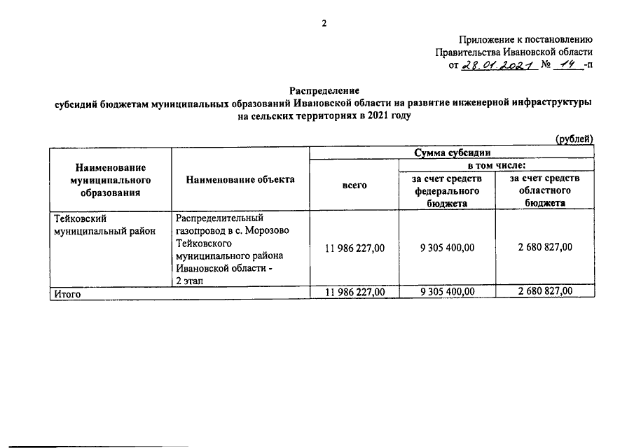 Постановление Правительства Ивановской области от 28.01.2021 N 14-п "О распределении субсидий бюджетам муниципальных образований Ивановской области на развитие инженерной инфраструктуры на сельских территориях в 2021 году"