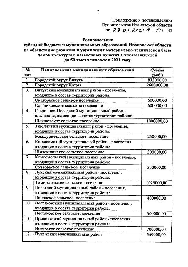 Постановление Правительства Ивановской области от 28.01.2021 N 13-п "О распределении субсидий бюджетам муниципальных образований Ивановской области на обеспечение развития и укрепления материально-технической базы домов культуры в населенных пунктах с числом жителей до 50 тысяч человек в 2021 году"