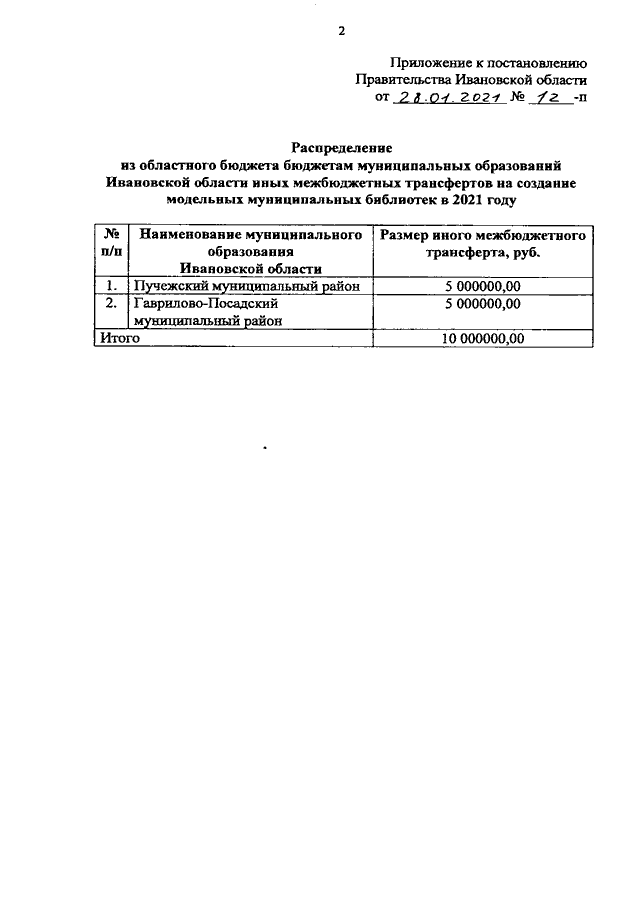 Постановление Правительства Ивановской области от 28.01.2021 N 12-п "О распределении из областного бюджета бюджетам муниципальных образований Ивановской области иных межбюджетных трансфертов на создание модельных муниципальных библиотек в 2021 году"