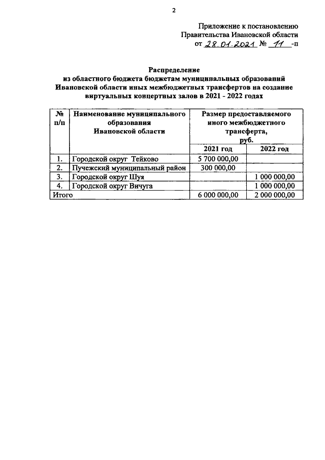Постановление Правительства Ивановской области от 28.01.2021 N 11-п "О распределении из областного бюджета бюджетам муниципальных образований Ивановской области иных межбюджетных трансфертов на создание виртуальных концертных залов в 2021 - 2022 годах"