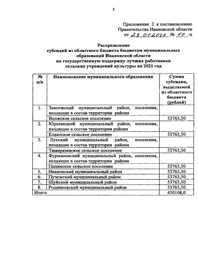 Постановление Правительства Ивановской области от 28.01.2021 N 10-п "О распределении субсидий из областного бюджета бюджетам муниципальных образований Ивановской области на государственную поддержку лучших сельских учреждений культуры и государственную поддержку лучших работников сельских учреждений культуры на 2021 год"