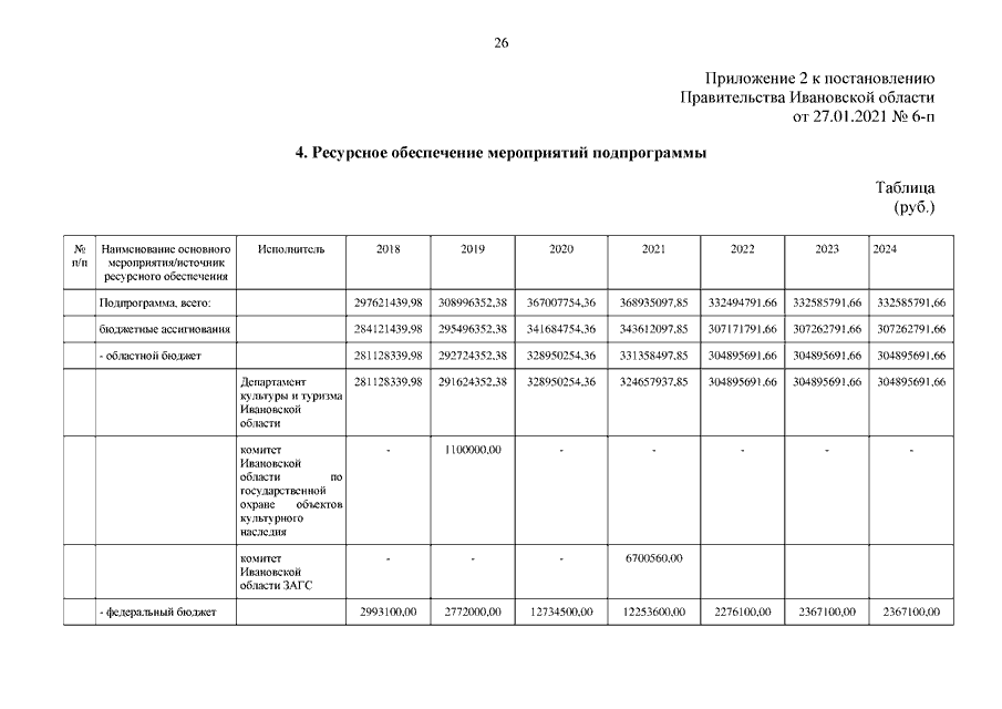 Постановление Правительства Ивановской области от 27.01.2021 N 6-п "О внесении изменений в постановление Правительства Ивановской области от 06.12.2017 N 455-п "Об утверждении государственной программы Ивановской области "Развитие культуры и туризма в Ивановской области" (вместе с "Порядком предоставления и распределения субсидий бюджетам муниципальных образований Ивановской области на создание центров культурного развития в городах с числом жителей до 300 тысяч человек")