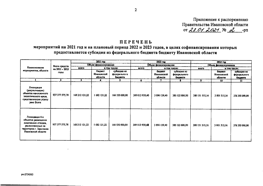 Распоряжение Правительства Ивановской области от 28.01.2021 N 2-рп "Об утверждении перечня мероприятий на 2021 год и плановый период 2022 и 2023 годов, в целях софинансирования которых предоставляется субсидия из федерального бюджета бюджету Ивановской области"