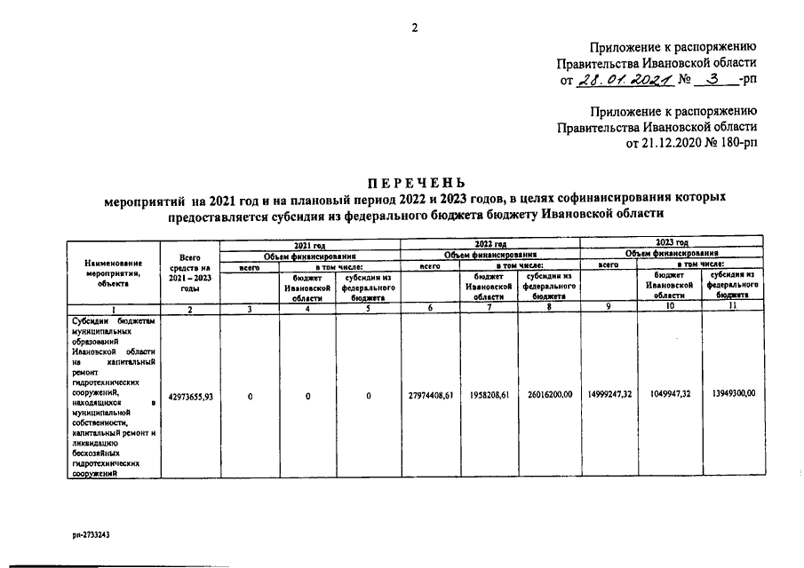 Распоряжение Правительства Ивановской области от 28.01.2021 N 3-рп "О внесении изменений в распоряжение Правительства Ивановской области от 21.12.2020 N 180-рп "Об утверждении перечня мероприятий на 2021 год и на плановый период 2022 и 2023 годов, в целях софинансирования которых предоставляется субсидия из федерального бюджета бюджету Ивановской области"