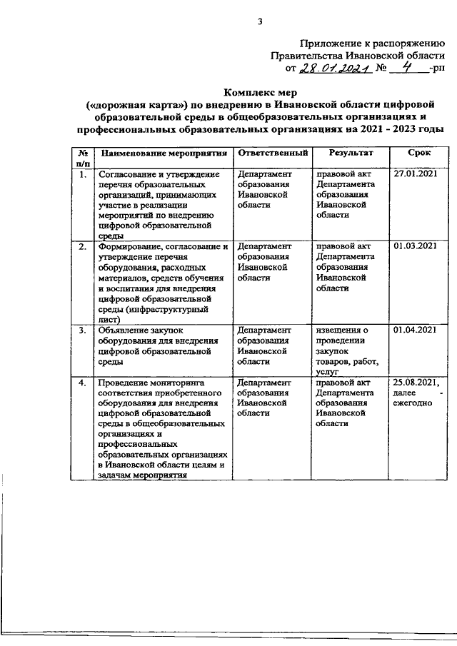 Распоряжение Правительства Ивановской области от 28.01.2021 N 4-рп "Об утверждении комплекса мер ("дорожной карты") по внедрению в Ивановской области цифровой образовательной среды в общеобразовательных организациях и профессиональных образовательных организациях на 2021 - 2023 годы"