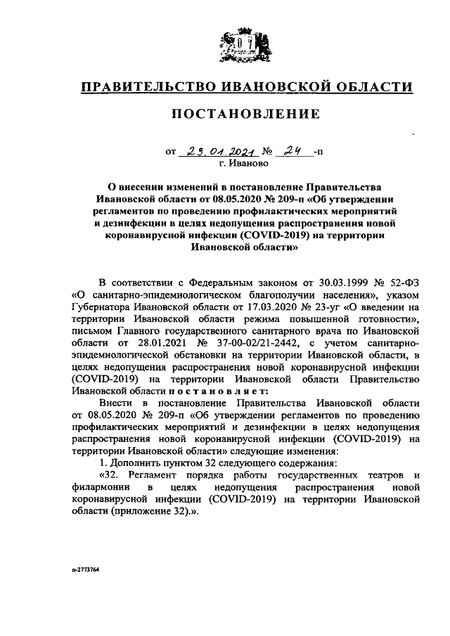 Постановление Правительства Ивановской области от 29.01.2021 N 24-п "О внесении изменений в постановление Правительства Ивановской области от 08.05.2020 N 209-п "Об утверждении регламентов по проведению профилактических мероприятий и дезинфекции в целях недопущения распространения новой коронавирусной инфекции (COVID-2019) на территории Ивановской области" (вместе с "Регламентом порядка работы государственных театров и филармонии в целях недопущения распространения новой коронавирусной инфекции (COVID-2019) на территории Ивановской области")