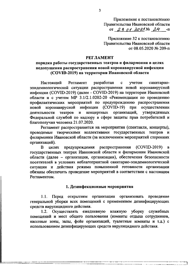 Постановление Правительства Ивановской области от 29.01.2021 N 24-п "О внесении изменений в постановление Правительства Ивановской области от 08.05.2020 N 209-п "Об утверждении регламентов по проведению профилактических мероприятий и дезинфекции в целях недопущения распространения новой коронавирусной инфекции (COVID-2019) на территории Ивановской области" (вместе с "Регламентом порядка работы государственных театров и филармонии в целях недопущения распространения новой коронавирусной инфекции (COVID-2019) на территории Ивановской области")