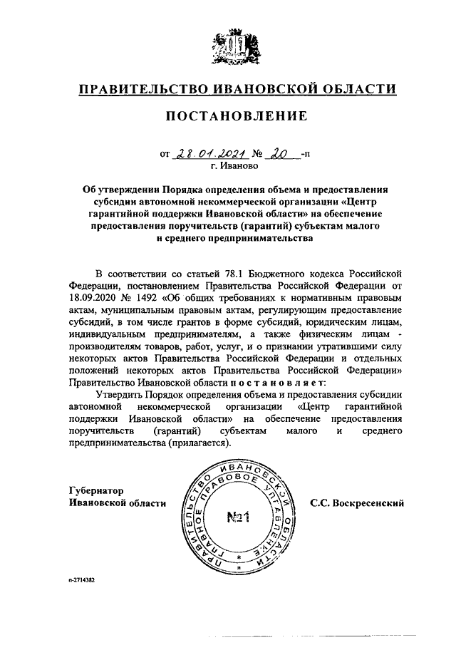 Постановление Правительства Ивановской области от 28.01.2021 N 20-п "Об утверждении Порядка определения объема и предоставления субсидии автономной некоммерческой организации "Центр гарантийной поддержки Ивановской области" на обеспечение предоставления поручительств (гарантий) субъектам малого и среднего предпринимательства"