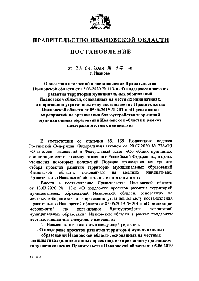 Постановление Правительства Ивановской области от 28.01.2021 N 17-п "О внесении изменений в постановление Правительства Ивановской области от 13.03.2020 N 113-п "О поддержке проектов развития территорий муниципальных образований Ивановской области, основанных на местных инициативах, и о признании утратившим силу постановления Правительства Ивановской области от 05.06.2019 N 201-п "О реализации мероприятий по организации благоустройства территорий муниципальных образований Ивановской области в рамках поддержки местных инициатив"