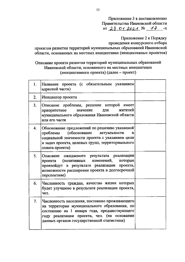 Постановление Правительства Ивановской области от 28.01.2021 N 17-п "О внесении изменений в постановление Правительства Ивановской области от 13.03.2020 N 113-п "О поддержке проектов развития территорий муниципальных образований Ивановской области, основанных на местных инициативах, и о признании утратившим силу постановления Правительства Ивановской области от 05.06.2019 N 201-п "О реализации мероприятий по организации благоустройства территорий муниципальных образований Ивановской области в рамках поддержки местных инициатив"