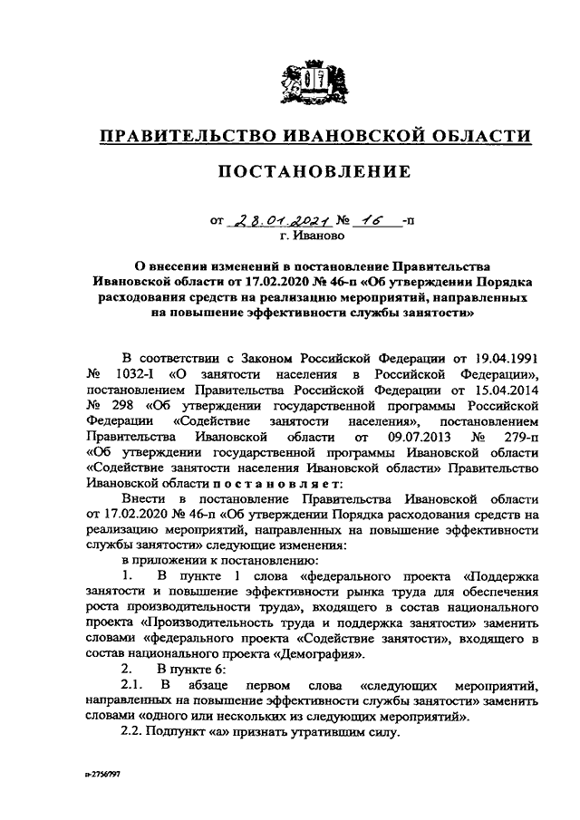Постановление Правительства Ивановской области от 28.01.2021 N 16-п "О внесении изменений в постановление Правительства Ивановской области от 17.02.2020 N 46-п "Об утверждении Порядка расходования средств на реализацию мероприятий, направленных на повышение эффективности службы занятости"