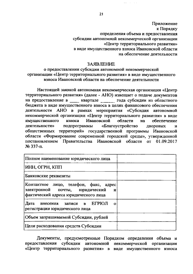 Постановление Правительства Ивановской области от 27.01.2021 N 8-п "О внесении изменений в постановление Правительства Ивановской области от 01.09.2017 N 337-п "Об утверждении государственной программы Ивановской области "Формирование современной городской среды" и постановление Правительства Ивановской области от 31.12.2019 N 568-п "О внесении изменений в постановление Правительства Ивановской области от 01.09.2017 N 337-п "Об утверждении государственной программы Ивановской области "Формирование современной городской среды" и об утверждении Порядка определения объема и предоставления субсидии автономной некоммерческой организации "Центр территориального развития Ивановской области" в виде имущественного взноса Ивановской области на обеспечение деятельности"