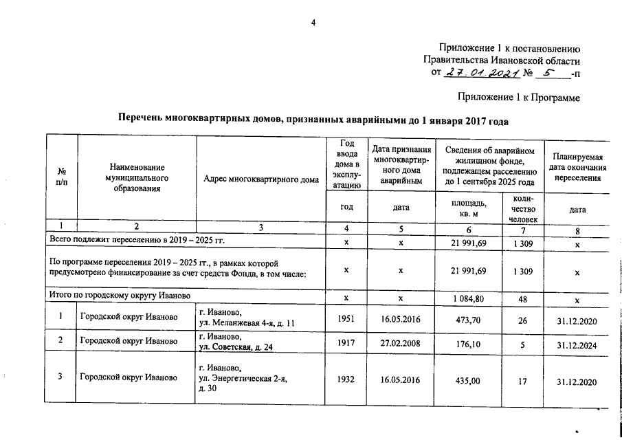 Постановление Правительства Ивановской области от 27.01.2021 N 5-п "О внесении изменений в постановление Правительства Ивановской области от 09.04.2019 N 131-п "Об утверждении региональной адресной программы "Переселение граждан из аварийного жилищного фонда на территории Ивановской области на 2019 - 2025 годы" (вместе с "Перечнем многоквартирных домов, признанных аварийными до 1 января 2017 года", "Планом реализации мероприятий по переселению граждан из аварийного жилищного фонда, признанного таковым до 1 января 2017 года, по способам переселения", "Планом мероприятий по переселению граждан из аварийного жилищного фонда, признанного таковым до 1 января 2017 года")