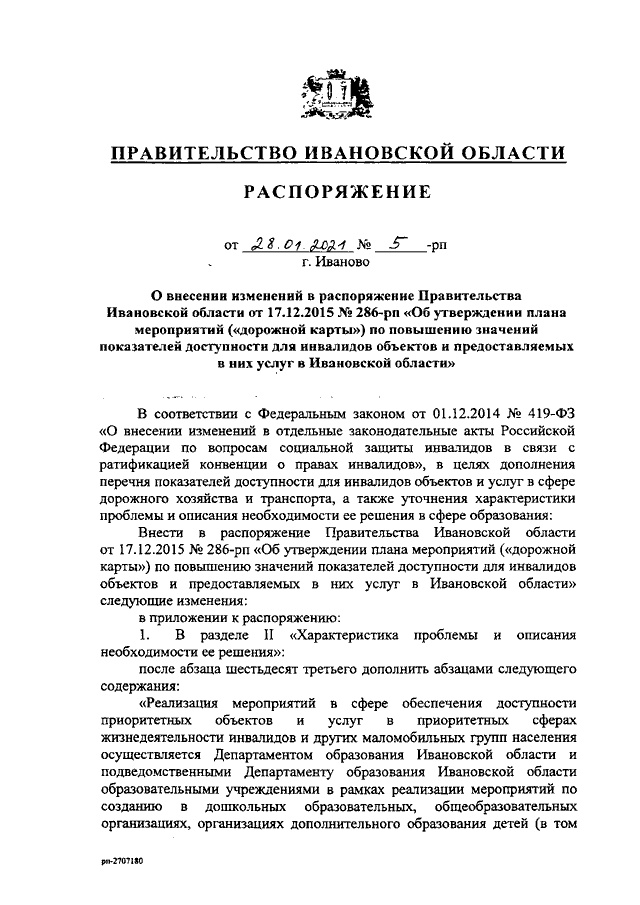 Распоряжение Правительства Ивановской области от 28.01.2021 N 5-рп "О внесении изменений в распоряжение Правительства Ивановской области от 17.12.2015 N 286-рп "Об утверждении плана мероприятий ("дорожной карты") по повышению значений показателей доступности для инвалидов объектов и предоставляемых в них услуг в Ивановской области"