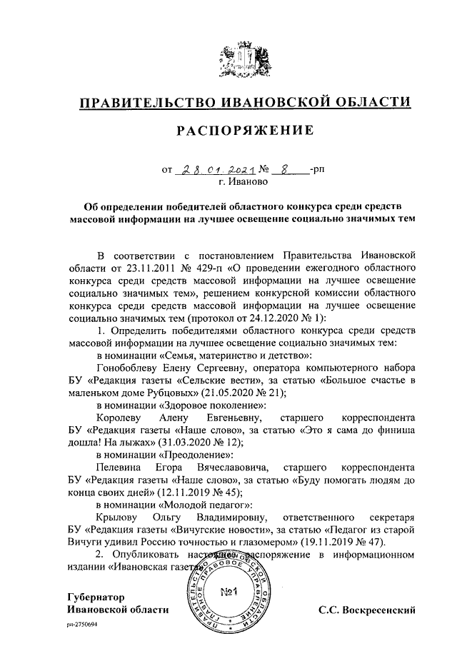 Распоряжение Правительства Ивановской области от 28.01.2021 N 8-рп "Об определении победителей областного конкурса среди средств массовой информации на лучшее освещение социально значимых тем"