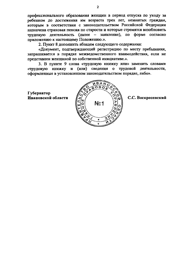 Постановление Правительства Ивановской области от 29.01.2021 N 30-п "О внесении изменений в постановление Правительства Ивановской области от 01.08.2012 N 275-п "Об утверждении Положения о порядке и условиях направления женщин в период отпуска по уходу за ребенком до достижения им возраста трех лет, незанятых граждан, которым в соответствии с законодательством Российской Федерации назначена страховая пенсия по старости и которые стремятся возобновить трудовую деятельность, для прохождения профессионального обучения или получения дополнительного профессионального образования"