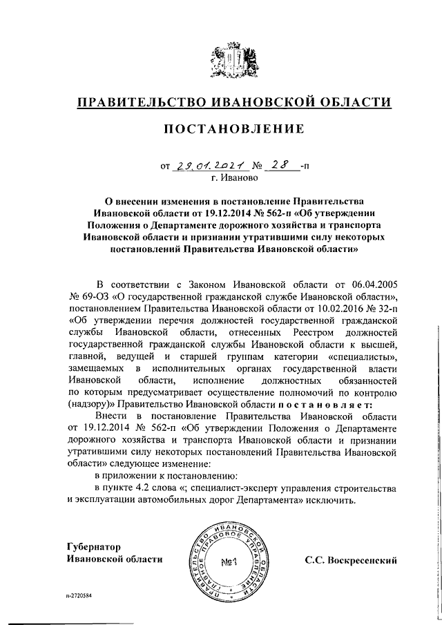 Постановление Правительства Ивановской области от 29.01.2021 N 28-п "О внесении изменения в постановление Правительства Ивановской области от 19.12.2014 N 562-п "Об утверждении Положения о Департаменте дорожного хозяйства и транспорта Ивановской области и признании утратившими силу некоторых постановлений Правительства Ивановской области"