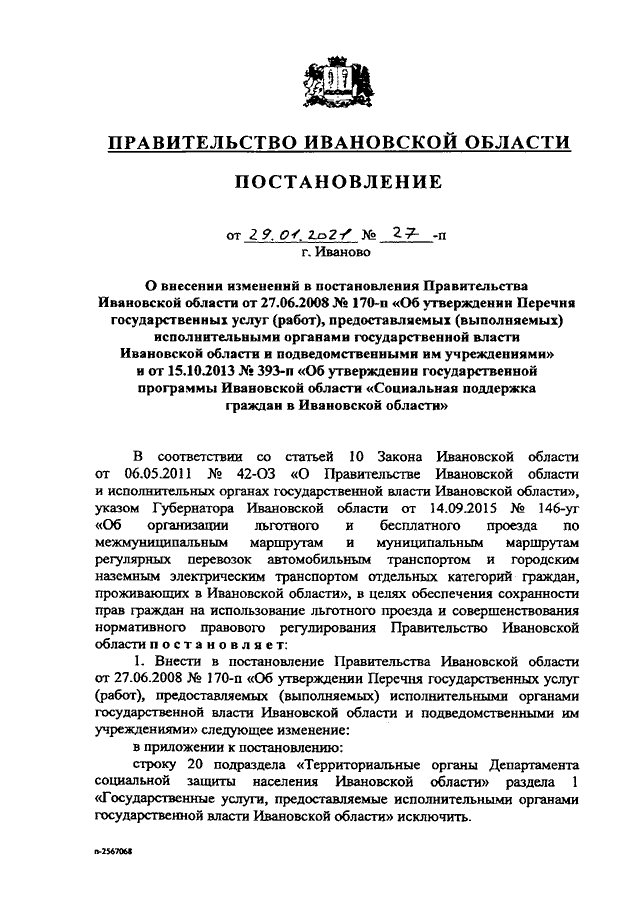 Постановление Правительства Ивановской области от 29.01.2021 N 27-п "О внесении изменений в постановления Правительства Ивановской области от 27.06.2008 N 170-п "Об утверждении Перечня государственных услуг (работ), предоставляемых (выполняемых) исполнительными органами государственной власти Ивановской области и подведомственными им учреждениями" и от 15.10.2013 N 393-п "Об утверждении государственной программы Ивановской области "Социальная поддержка граждан в Ивановской области"