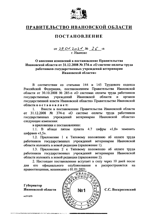 Постановление Правительства Ивановской области от 29.01.2021 N 26-п "О внесении изменений в постановление Правительства Ивановской области от 31.12.2008 N 374-п "О системе оплаты труда работников государственных учреждений ветеринарии Ивановской области"