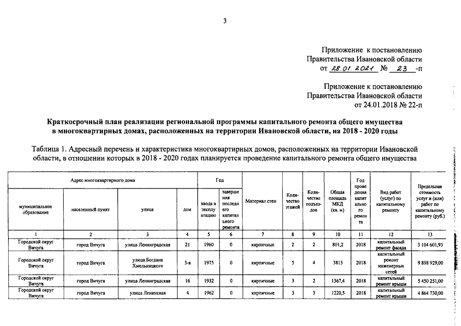 Постановление Правительства Ивановской области от 28.01.2021 N 23-п "О внесении изменения в постановление Правительства Ивановской области от 24.01.2018 N 22-п "Об утверждении краткосрочного плана реализации региональной программы капитального ремонта общего имущества в многоквартирных домах, расположенных на территории Ивановской области, на 2018 - 2020 годы"
