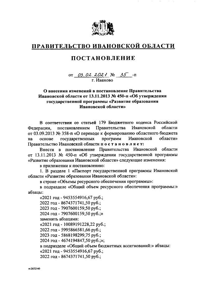 Постановление Правительства Ивановской области от 03.02.2021 N 35-п "О внесении изменений в постановление Правительства Ивановской области от 13.11.2013 N 450-п "Об утверждении государственной программы "Развитие образования Ивановской области" (вместе с "Порядком предоставления и распределения субсидий бюджетам муниципальных районов и городских округов Ивановской области на создание и обеспечение функционирования центров образования естественно-научной и технологической направленностей в общеобразовательных организациях, расположенных в сельской местности и малых городах", "Порядком предоставления и распределения субсидий бюджетам муниципальных районов и городских округов Ивановской области на создание детских технопарков "Кванториум", "Порядком предоставления субсидий из областного бюджета на создание дополнительных мест для детей в возрасте от 1,5 до 3 лет любой направленности в организациях, осуществляющих образовательную деятельность (за исключением государственных, муниципальных), и у индивидуальных предпринимателей, осуществляющих образовательную деятельность по образовательным программам дошкольного образования, в том числе адаптированным, и присмотр и уход за детьми", "Порядком предоставления и распределения субсидий бюджетам муниципальных районов и городских округов Ивановской области на создание новых мест в образовательных организациях различных типов для реализации дополнительных общеразвивающих программ всех направленностей", "Порядком предоставления и распределения субсидий бюджетам муниципальных районов и городских округов Ивановской области на обеспечение образовательных организаций материально-технической базой для внедрения цифровой образовательной среды")