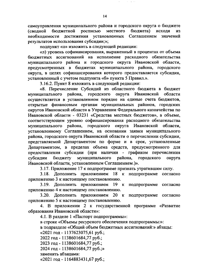 Постановление Правительства Ивановской области от 03.02.2021 N 35-п "О внесении изменений в постановление Правительства Ивановской области от 13.11.2013 N 450-п "Об утверждении государственной программы "Развитие образования Ивановской области" (вместе с "Порядком предоставления и распределения субсидий бюджетам муниципальных районов и городских округов Ивановской области на создание и обеспечение функционирования центров образования естественно-научной и технологической направленностей в общеобразовательных организациях, расположенных в сельской местности и малых городах", "Порядком предоставления и распределения субсидий бюджетам муниципальных районов и городских округов Ивановской области на создание детских технопарков "Кванториум", "Порядком предоставления субсидий из областного бюджета на создание дополнительных мест для детей в возрасте от 1,5 до 3 лет любой направленности в организациях, осуществляющих образовательную деятельность (за исключением государственных, муниципальных), и у индивидуальных предпринимателей, осуществляющих образовательную деятельность по образовательным программам дошкольного образования, в том числе адаптированным, и присмотр и уход за детьми", "Порядком предоставления и распределения субсидий бюджетам муниципальных районов и городских округов Ивановской области на создание новых мест в образовательных организациях различных типов для реализации дополнительных общеразвивающих программ всех направленностей", "Порядком предоставления и распределения субсидий бюджетам муниципальных районов и городских округов Ивановской области на обеспечение образовательных организаций материально-технической базой для внедрения цифровой образовательной среды")