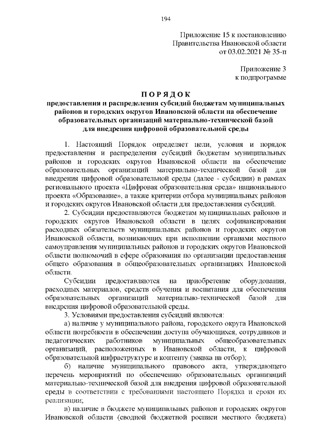 Постановление Правительства Ивановской области от 03.02.2021 N 35-п "О внесении изменений в постановление Правительства Ивановской области от 13.11.2013 N 450-п "Об утверждении государственной программы "Развитие образования Ивановской области" (вместе с "Порядком предоставления и распределения субсидий бюджетам муниципальных районов и городских округов Ивановской области на создание и обеспечение функционирования центров образования естественно-научной и технологической направленностей в общеобразовательных организациях, расположенных в сельской местности и малых городах", "Порядком предоставления и распределения субсидий бюджетам муниципальных районов и городских округов Ивановской области на создание детских технопарков "Кванториум", "Порядком предоставления субсидий из областного бюджета на создание дополнительных мест для детей в возрасте от 1,5 до 3 лет любой направленности в организациях, осуществляющих образовательную деятельность (за исключением государственных, муниципальных), и у индивидуальных предпринимателей, осуществляющих образовательную деятельность по образовательным программам дошкольного образования, в том числе адаптированным, и присмотр и уход за детьми", "Порядком предоставления и распределения субсидий бюджетам муниципальных районов и городских округов Ивановской области на создание новых мест в образовательных организациях различных типов для реализации дополнительных общеразвивающих программ всех направленностей", "Порядком предоставления и распределения субсидий бюджетам муниципальных районов и городских округов Ивановской области на обеспечение образовательных организаций материально-технической базой для внедрения цифровой образовательной среды")