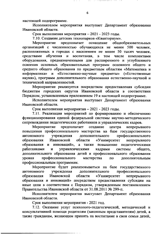 Постановление Правительства Ивановской области от 03.02.2021 N 35-п "О внесении изменений в постановление Правительства Ивановской области от 13.11.2013 N 450-п "Об утверждении государственной программы "Развитие образования Ивановской области" (вместе с "Порядком предоставления и распределения субсидий бюджетам муниципальных районов и городских округов Ивановской области на создание и обеспечение функционирования центров образования естественно-научной и технологической направленностей в общеобразовательных организациях, расположенных в сельской местности и малых городах", "Порядком предоставления и распределения субсидий бюджетам муниципальных районов и городских округов Ивановской области на создание детских технопарков "Кванториум", "Порядком предоставления субсидий из областного бюджета на создание дополнительных мест для детей в возрасте от 1,5 до 3 лет любой направленности в организациях, осуществляющих образовательную деятельность (за исключением государственных, муниципальных), и у индивидуальных предпринимателей, осуществляющих образовательную деятельность по образовательным программам дошкольного образования, в том числе адаптированным, и присмотр и уход за детьми", "Порядком предоставления и распределения субсидий бюджетам муниципальных районов и городских округов Ивановской области на создание новых мест в образовательных организациях различных типов для реализации дополнительных общеразвивающих программ всех направленностей", "Порядком предоставления и распределения субсидий бюджетам муниципальных районов и городских округов Ивановской области на обеспечение образовательных организаций материально-технической базой для внедрения цифровой образовательной среды")
