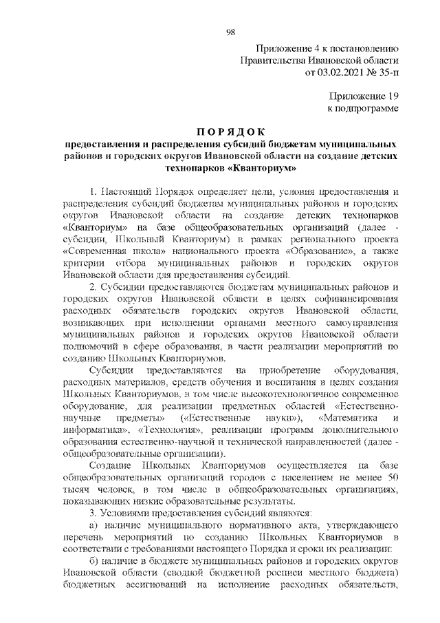 Постановление Правительства Ивановской области от 03.02.2021 N 35-п "О внесении изменений в постановление Правительства Ивановской области от 13.11.2013 N 450-п "Об утверждении государственной программы "Развитие образования Ивановской области" (вместе с "Порядком предоставления и распределения субсидий бюджетам муниципальных районов и городских округов Ивановской области на создание и обеспечение функционирования центров образования естественно-научной и технологической направленностей в общеобразовательных организациях, расположенных в сельской местности и малых городах", "Порядком предоставления и распределения субсидий бюджетам муниципальных районов и городских округов Ивановской области на создание детских технопарков "Кванториум", "Порядком предоставления субсидий из областного бюджета на создание дополнительных мест для детей в возрасте от 1,5 до 3 лет любой направленности в организациях, осуществляющих образовательную деятельность (за исключением государственных, муниципальных), и у индивидуальных предпринимателей, осуществляющих образовательную деятельность по образовательным программам дошкольного образования, в том числе адаптированным, и присмотр и уход за детьми", "Порядком предоставления и распределения субсидий бюджетам муниципальных районов и городских округов Ивановской области на создание новых мест в образовательных организациях различных типов для реализации дополнительных общеразвивающих программ всех направленностей", "Порядком предоставления и распределения субсидий бюджетам муниципальных районов и городских округов Ивановской области на обеспечение образовательных организаций материально-технической базой для внедрения цифровой образовательной среды")