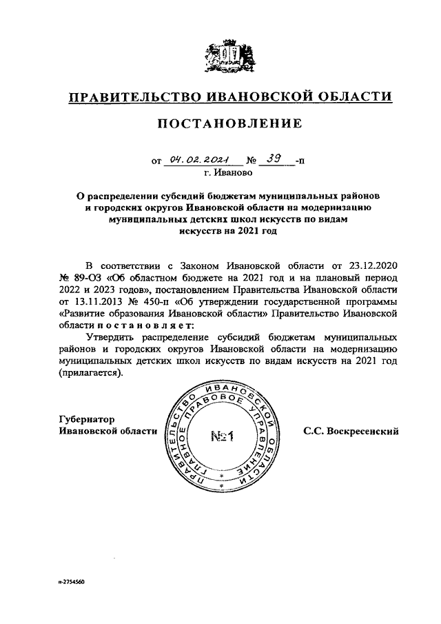 Постановление Правительства Ивановской области от 04.02.2021 N 39-п "О распределении субсидий бюджетам муниципальных районов и городских округов Ивановской области на модернизацию муниципальных детских школ искусств по видам искусств на 2021 год"