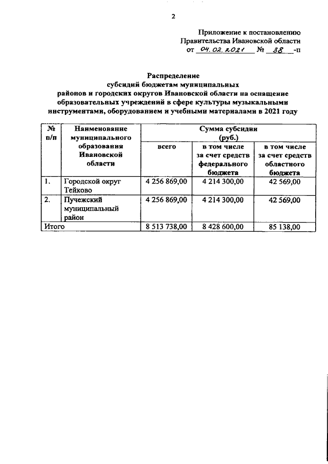 Постановление Правительства Ивановской области от 04.02.2021 N 38-п "О распределении субсидий бюджетам муниципальных районов и городских округов Ивановской области на оснащение образовательных учреждений в сфере культуры музыкальными инструментами, оборудованием и учебными материалами в 2021 году"