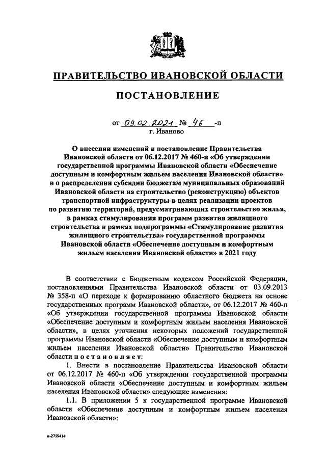 Постановление Правительства Ивановской области от 09.02.2021 N 46-п "О внесении изменений в постановление Правительства Ивановской области от 06.12.2017 N 460-п "Об утверждении государственной программы Ивановской области "Обеспечение доступным и комфортным жильем населения Ивановской области" и о распределении субсидии бюджетам муниципальных образований Ивановской области на строительство (реконструкцию) объектов транспортной инфраструктуры в целях реализации проектов по развитию территорий, предусматривающих строительство жилья, в рамках стимулирования программ развития жилищного строительства в рамках подпрограммы "Стимулирование развития жилищного строительства" государственной программы Ивановской области "Обеспечение доступным и комфортным жильем населения Ивановской области" в 2021 году"
