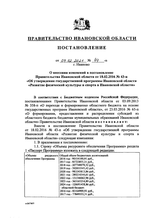 Постановление Правительства Ивановской области от 09.02.2021 N 44-п "О внесении изменений в постановление Правительства Ивановской области от 18.02.2016 N 43-п "Об утверждении государственной программы Ивановской области "Развитие физической культуры и спорта в Ивановской области"