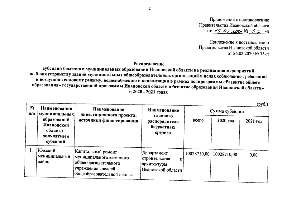 Постановление Правительства Ивановской области от 15.02.2021 N 57-п "О внесении изменения в постановление Правительства Ивановской области от 26.02.2020 N 73-п "О распределении субсидий бюджетам муниципальных образований Ивановской области на реализацию мероприятий по благоустройству зданий муниципальных общеобразовательных организаций в целях соблюдения требований к воздушно-тепловому режиму, водоснабжению и канализации в рамках подпрограммы "Развитие общего образования" государственной программы Ивановской области "Развитие образования Ивановской области" в 2020 - 2021 годах"