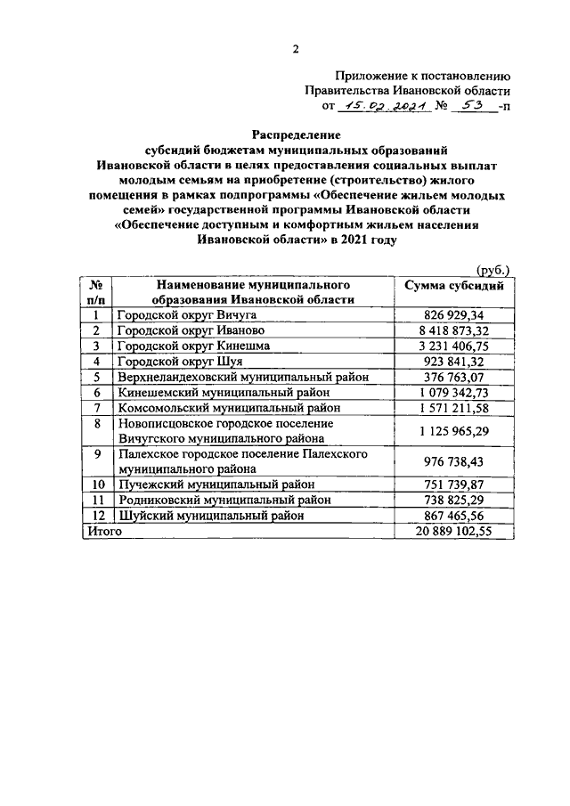Постановление Правительства Ивановской области от 15.02.2021 N 53-п "О распределении субсидий бюджетам муниципальных образований Ивановской области в целях предоставления социальных выплат молодым семьям на приобретение (строительство) жилого помещения в рамках подпрограммы "Обеспечение жильем молодых семей" государственной программы Ивановской области "Обеспечение доступным и комфортным жильем населения Ивановской области" в 2021 году"