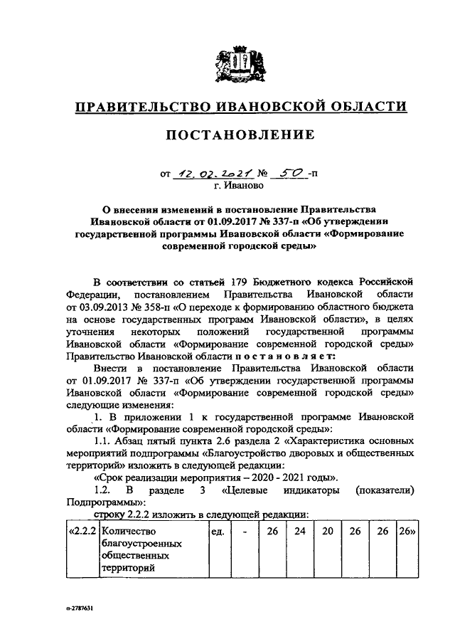Постановление Правительства Ивановской области от 12.02.2021 N 50-п "О внесении изменений в постановление Правительства Ивановской области от 01.09.2017 N 337-п "Об утверждении государственной программы Ивановской области "Формирование современной городской среды"