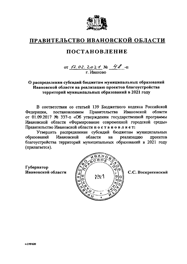 Постановление Правительства Ивановской области от 12.02.2021 N 48-п "О распределении субсидий бюджетам муниципальных образований Ивановской области на реализацию проектов благоустройства территорий муниципальных образований в 2021 году"