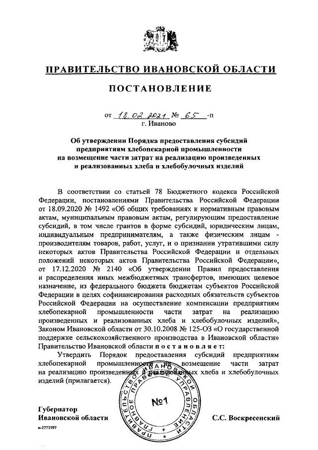 Постановление Правительства Ивановской области от 18.02.2021 N 65-п "Об утверждении Порядка предоставления субсидий предприятиям хлебопекарной промышленности на возмещение части затрат на реализацию произведенных и реализованных хлеба и хлебобулочных изделий"