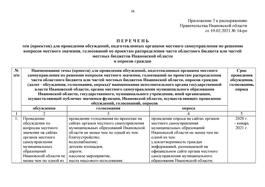 Распоряжение Правительства Ивановской области от 19.02.2021 N 14-рп "Об организации работы по участию Ивановской области в пилотном проекте по реализации единого окна цифровой обратной связи" (вместе с "Планом мероприятий ("дорожной картой") по проведению апробации технологических решений, сформированных на базе федеральной государственной информационной системы "Единый портал государственных и муниципальных услуг (функций)", "Перечнем категорий (подкатегорий) сообщений, поданных с использованием электронной формы федеральной государственной информационной системы "Единый портал государственных и муниципальных услуг (функций)", и сроками подготовки ответов на сообщения", "Перечнем тем (проектов) для проведения обсуждений, подготовленных органами местного самоуправления по решению вопросов местного значения, голосований по проектам распределения части областного бюджета или частей местных бюджетов Ивановской области и опросов граждан", "Перечнем участников апробации технологических решений, сформированных на базе федеральной государственной информационной системы "Единый портал государственных и муниципальных услуг (функций)")