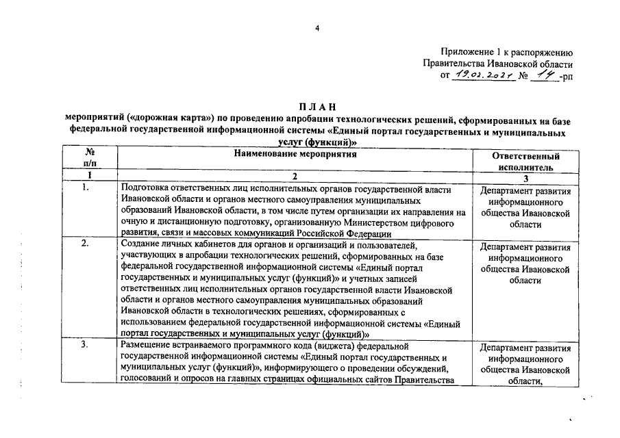 Распоряжение Правительства Ивановской области от 19.02.2021 N 14-рп "Об организации работы по участию Ивановской области в пилотном проекте по реализации единого окна цифровой обратной связи" (вместе с "Планом мероприятий ("дорожной картой") по проведению апробации технологических решений, сформированных на базе федеральной государственной информационной системы "Единый портал государственных и муниципальных услуг (функций)", "Перечнем категорий (подкатегорий) сообщений, поданных с использованием электронной формы федеральной государственной информационной системы "Единый портал государственных и муниципальных услуг (функций)", и сроками подготовки ответов на сообщения", "Перечнем тем (проектов) для проведения обсуждений, подготовленных органами местного самоуправления по решению вопросов местного значения, голосований по проектам распределения части областного бюджета или частей местных бюджетов Ивановской области и опросов граждан", "Перечнем участников апробации технологических решений, сформированных на базе федеральной государственной информационной системы "Единый портал государственных и муниципальных услуг (функций)")