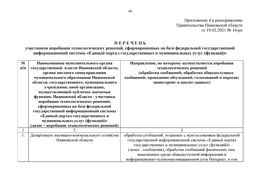 Распоряжение Правительства Ивановской области от 19.02.2021 N 14-рп "Об организации работы по участию Ивановской области в пилотном проекте по реализации единого окна цифровой обратной связи" (вместе с "Планом мероприятий ("дорожной картой") по проведению апробации технологических решений, сформированных на базе федеральной государственной информационной системы "Единый портал государственных и муниципальных услуг (функций)", "Перечнем категорий (подкатегорий) сообщений, поданных с использованием электронной формы федеральной государственной информационной системы "Единый портал государственных и муниципальных услуг (функций)", и сроками подготовки ответов на сообщения", "Перечнем тем (проектов) для проведения обсуждений, подготовленных органами местного самоуправления по решению вопросов местного значения, голосований по проектам распределения части областного бюджета или частей местных бюджетов Ивановской области и опросов граждан", "Перечнем участников апробации технологических решений, сформированных на базе федеральной государственной информационной системы "Единый портал государственных и муниципальных услуг (функций)")