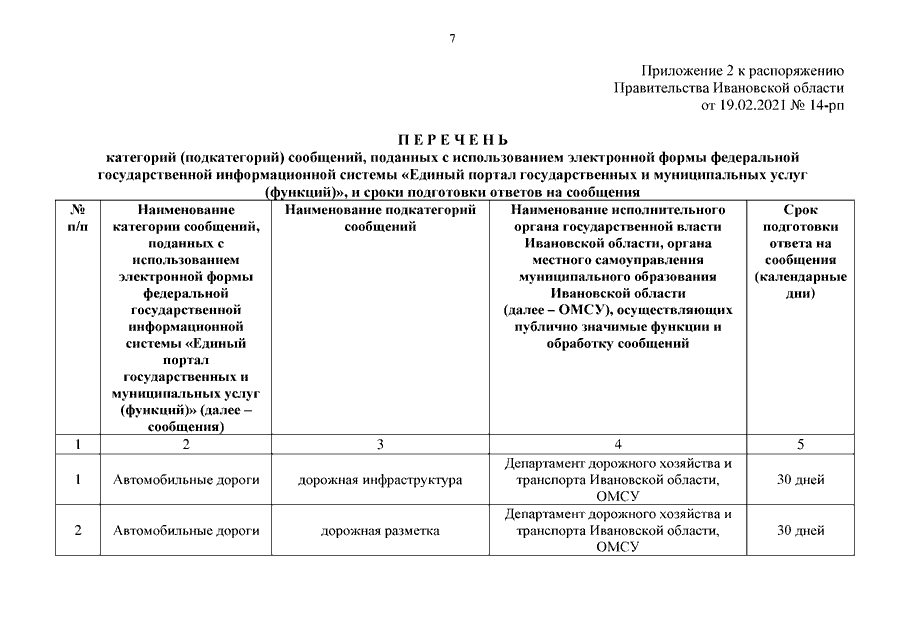 Распоряжение Правительства Ивановской области от 19.02.2021 N 14-рп "Об организации работы по участию Ивановской области в пилотном проекте по реализации единого окна цифровой обратной связи" (вместе с "Планом мероприятий ("дорожной картой") по проведению апробации технологических решений, сформированных на базе федеральной государственной информационной системы "Единый портал государственных и муниципальных услуг (функций)", "Перечнем категорий (подкатегорий) сообщений, поданных с использованием электронной формы федеральной государственной информационной системы "Единый портал государственных и муниципальных услуг (функций)", и сроками подготовки ответов на сообщения", "Перечнем тем (проектов) для проведения обсуждений, подготовленных органами местного самоуправления по решению вопросов местного значения, голосований по проектам распределения части областного бюджета или частей местных бюджетов Ивановской области и опросов граждан", "Перечнем участников апробации технологических решений, сформированных на базе федеральной государственной информационной системы "Единый портал государственных и муниципальных услуг (функций)")