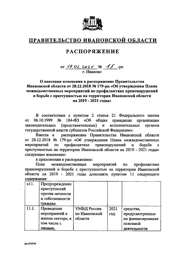Распоряжение Правительства Ивановской области от 19.02.2021 N 15-рп "О внесении изменения в распоряжение Правительства Ивановской области от 28.12.2018 N 179-рп "Об утверждении Плана межведомственных мероприятий по профилактике правонарушений и борьбе с преступностью на территории Ивановской области на 2019 - 2021 годы"